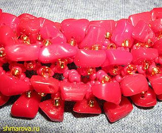 Данный комплект выполнен в технике сетка с одновременным вывязыванием меха с крошкой коралла. В браслете вяжется прямоугольная сетка, а для ожерелья выполняется окат по шее. | ||