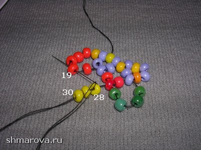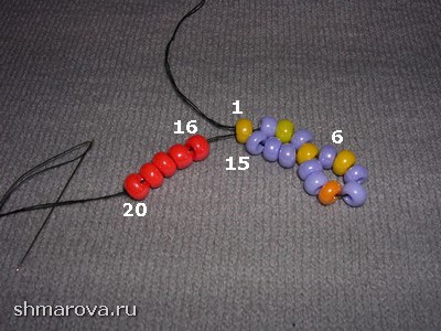 Набираем пять бисерин (с 16-ой по 20-ую). Это нижний край изделия.
